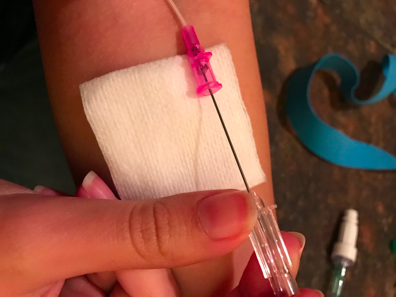 . Stabilize the vein with your non-dominant hand and insert the IVs needle into the vein watching carefully for blood return or a blood flash in the chamber. The process of starting an intravenous line IV is quite simple. When you get in the vein you will have a little bit of blood but the needle is slightly ahead of the catheter.